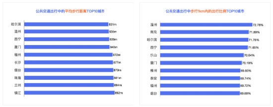 虽然哈尔滨通勤距离有所增加,但依旧是特大城市中绿色通勤指数最高的城市,沈阳紧随其后。同时,哈尔滨的公共交通出行中平均步行距离短,且步行一公里内的出行比例较高。