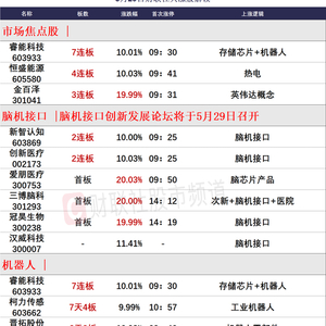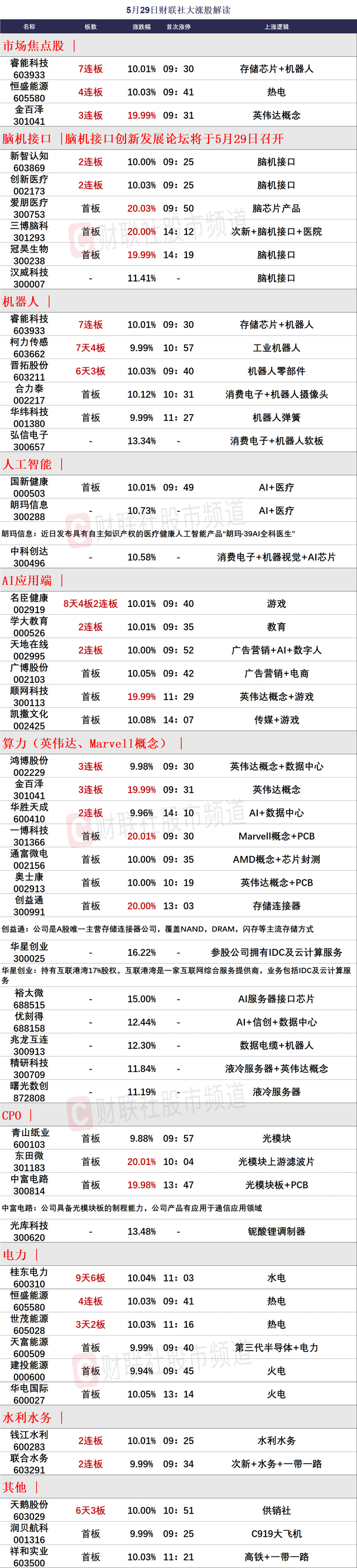 【5月29日涨停分析】今日共38股涨停,连板股总数12只,19股封板未遂,封板率为67%(不含ST股、退市股及未开板新股)。个股方面,机器人板块睿能科技7板、柯力传感7天4板、晋拓股份6天3板,电力股桂东电力9天6板、恒盛能源4板,算力板块金百泽创业板3板、鸿博股份3板,脑机接口概念股新智认知2板、创新医疗2板,游戏股名臣健康8天4板,供销社概念股天鹅股份6天3板。今日收涨个股1623只,收跌个股3230只。