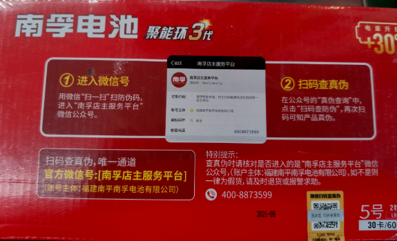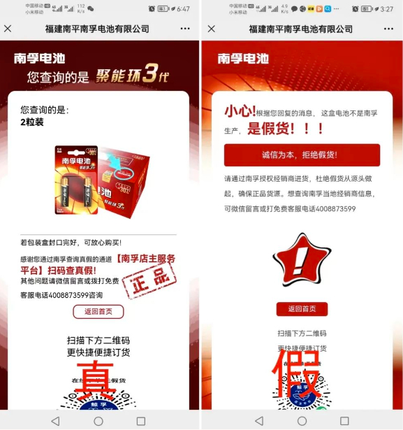 进入“南孚”店主服务平台后,点击右下角的真伪查询对外包装二维码进行二次扫描,在扫描结果页面选择电池的生产日期就能得到电池的真伪查询结果。