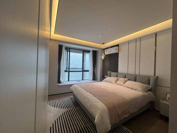 该户型整体方正,实用率高,功能分区合理。进深约8.4米的客餐厅,完全不输市面上100多㎡的户型,且拥有270°视野,窗外的景色一览无余。约4.5米进深的主卧,同样满足了超大卧室的居家品质,同时大飘窗的设计,让卧室视野更广,拥有明亮光线。