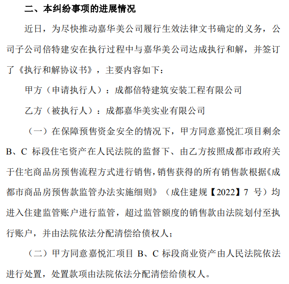 公告称:近日,为尽快推动嘉华美公司(嘉悦汇项目开发商)履行生效法律文书确定的义务,公司子公司倍特建安在执行过程中与嘉华美公司达成执行和解,并签订了《执行和解协议书》。