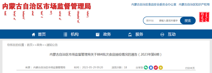 内蒙古自治区市场监管局关于884批次食品抽检情况的通告(2023年第6期)