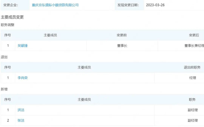 在增资的同时,京东盛际小贷的高管也进行了调整。企查查APP显示,3月26日,京东盛际小贷经理李尚荣退出,由董事长吴献锋兼任。新增洪洁和张洁为副经理。