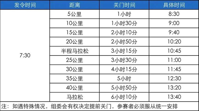 在此基础上,组委会在马拉松、半程马拉松4公里处增设关门时间,该处关门时间为48分钟(即8∶18)。组委会提醒参赛选手:合理调整配速,尽快通过4公里点,如未在关门时间内经过的,请选手立即撤出赛道,听从现场裁判安排。