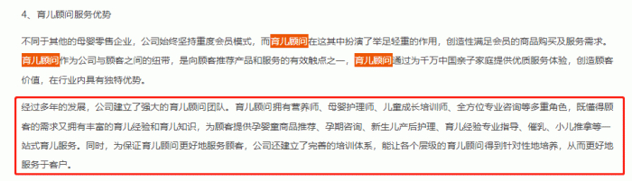 孩子王2022年报称,育儿顾问拥有营养师、母婴护理师、儿童成长培训师、全方位专业咨询等多重角色,既懂得顾客的需求又拥有丰富的育儿经验和育儿知识,为顾客提供孕婴童商品推荐、孕期咨询、新生儿产后护理、育儿经验专业指导、催乳、小儿推拿等一站式育儿服务。