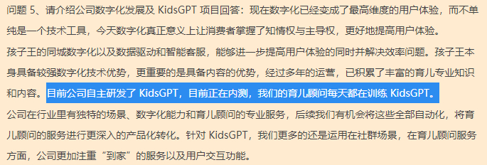 根据公司回复,KidsGPT是由公司自主研发,当时正在内测,育儿顾问每天训练KidsGPT。