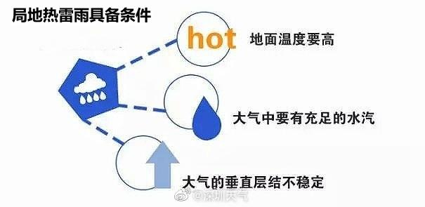 夏季的午后,受日照的影响,近地面层变得不稳定,对流作用也随之发展加强,湿度较大的情况下就容易产生雷雨。这种雷雨的强弱取决于局地加热的程度,即最高温度的高低,因此把这样的雷雨称为“热雷雨”。一般来说温度越高,雷雨云团发展越旺盛,雷雨云团越旺盛,雨势也会越大。通常“热雷雨”的降雨范围不大,但具有明显突发性,就像煮开水,不知道会在哪里冒泡,所以夏天常备伞,可以防晒还防被“局”。