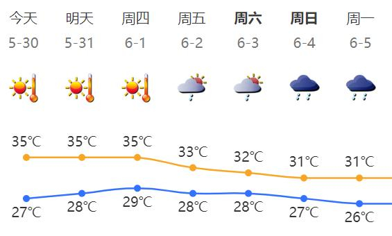 预计30日-6月1日最高气温35℃或以上,中北部和人口密集区可达36℃或以上,午后有局地短时雷阵雨,部分时间有霾,其中30日气温27-35℃。