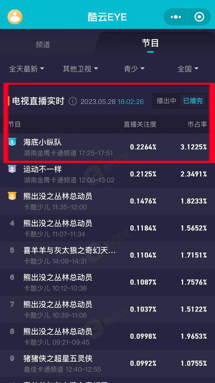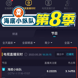 《海底小纵队》第八季,首播日覆盖超百家平台,包揽各媒体渠道头部。分别是央视一套、金鹰卡通、中国教育电视台,咪咕优爱腾芒果TV五大视频平台,全国31省区市超90个IPTV,以及华为、小米、海信等6家头部OTT平台。