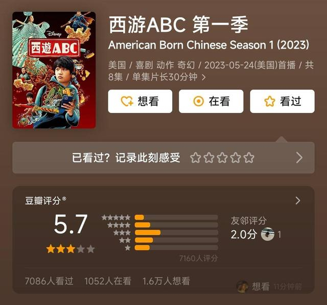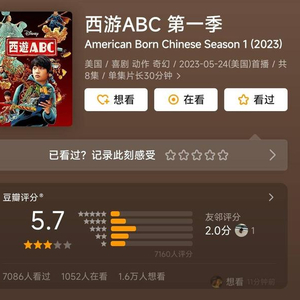 5月26日,《西游ABC》豆瓣平台开分,1000多名网友联合打出了“5.8”低分,目前,评分又降到了5.7.