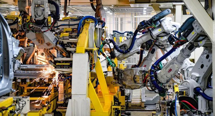 经过中转的冲压件来到焊装车间。在方寸之间,机械手闪转腾挪,施展硬核“手艺”,从取件到焊接,完美完成焊接工作。