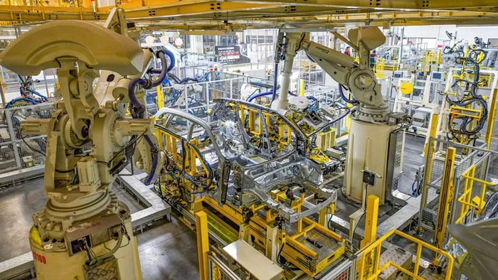 在预拼工位上,预拼机器人正在上下挥舞“手臂”开展工作。记者看到,两台机器人将上方平台输送过来的左右侧围总成抓取,与下车体进行自动化预拼,然后输送到总拼工位。