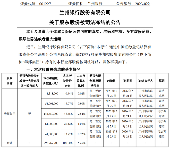 5月29日晚间,兰州银行(001227.SZ)公告称,该行股东华邦控股集团有限公司持有的该行5.25%股份被司法冻结。