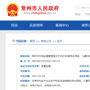 中国质量新闻网讯 据江苏省常州市人民政府网站2023年5月29日消息,常州市市场监督管理局发布关于2023年度学生用品、儿童玩具产品质量监督抽查结果的通报。