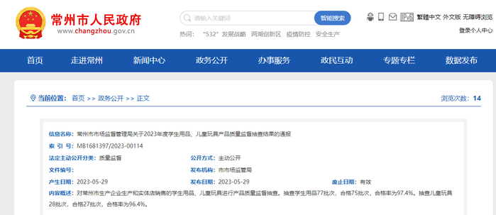 通报称,2023年2月起,常州市市场监督管理局根据《2023年常州市重点监督产品目录》,依据《中华人民共和国产品质量法》《中华人民共和国政府信息公开条例》和《产品质量监督抽查管理暂行办法》等规定,委托斯坦德检测集团股份有限公司,对常州市生产企业生产和实体店销售的学生用品、儿童玩具进行产品质量监督抽查。抽查学生用品77批次,合格75批次,合格率为97.4%。抽查儿童玩具28批次,合格27批次,合格率为96.4%。