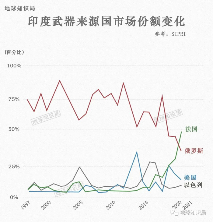 印度还是俄罗斯武器的主要买家,尽管它一直试图使其军事装备来源多样化,近年来越来越多地转向美国和法国等国家。