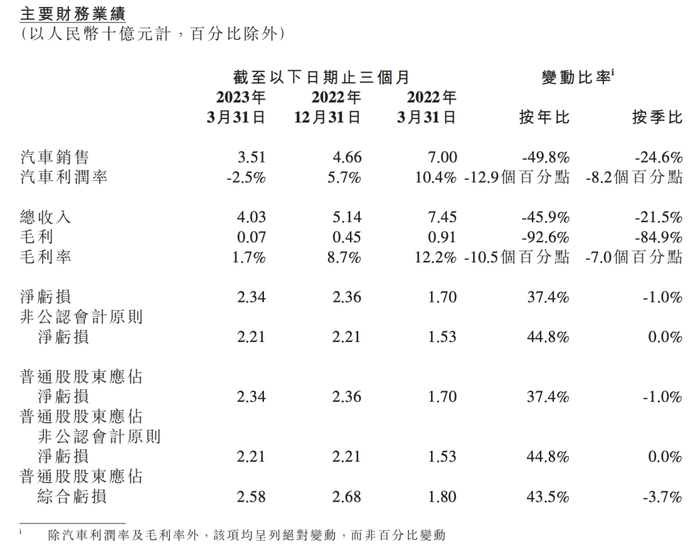 何小鹏身价大跌与小鹏汽车的发展不无关系。日前,小鹏汽车公布一季度财报显示,报告期内总营业40.3亿元,同比下滑45.9%,其中汽车销售收入35.1亿元,同比下滑49.8%;净亏损达23.4亿元,同期净亏损17.0亿元,亏损同比扩大37.4%;更危险的是,小鹏汽车当季整体毛利率暴跌至1.7%,其汽车毛利率更是跌至-2.5%,这是小鹏近三年以来首次出现负数汽车毛利率。同时,小鹏汽车对于二季度业绩也表现出极度悲观,其预计二季度营收45亿元至47亿元,同比减少约36.8-39.5%。