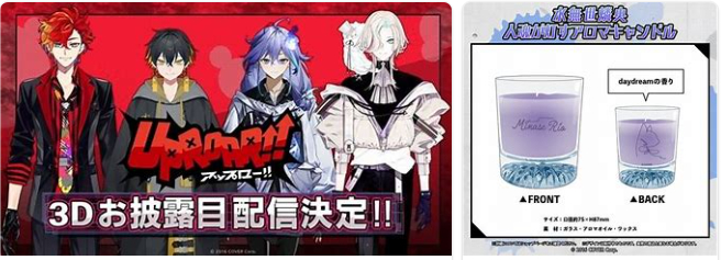 去年,hololive的男性组合Holostars小分队“UPROAR!!”,举办了 3D形象披露直播活动,同时还根据各成员特色分别推出了不同的周边产品。