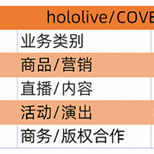 hololive的四大业务中,直播/内容 与 活动/演出,以孵化虚拟主播(VTuber)及粉丝增长为主,商品/营销 和 商务/版权合作则是在前者基础上,利用IP展开商务活动。