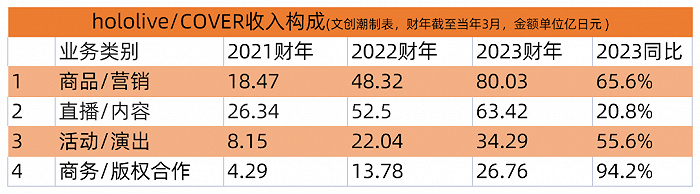 这一年,随着IP影响力和粉丝数量的提升,商品成了hololive第一大业务,年收入达到80亿日元;增幅最大的是版权合作,收入接近翻番。