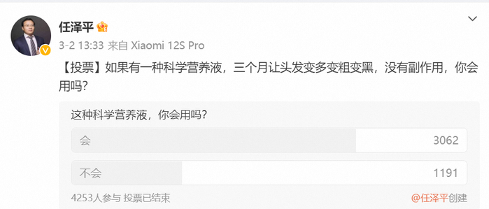 次日,任泽平趁热打铁,在微博上发布了一个“你有生发养发需求(治疗脱发、让头发变多变粗变黑)吗?”的投票,用投票来汇聚流量,最终吸引了超4000人参与投票。有细心的网友提问,“是不是要卖生发水了?”但当时大家的想象也仅限于“打广告”。