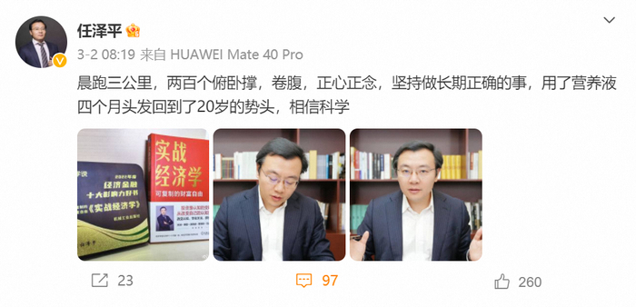 “晨跑三公里,一百个俯卧撑,卷腹。正心正念,坚持做长期正确的事”——这样的画风或许和经济学家格格不入,但却是任泽平已经保持了一段时间的微博日常。