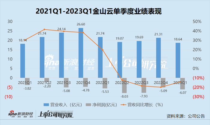 在降价潮的同一时期,金山云发布了2023年一季报,实现营业收入18.64亿元,在2022年全年业绩负增长之后再度下滑14.23%,实现净亏损6.07亿元,亏损幅度同比扩大9.71%,与实现盈利的差距越来越大。
