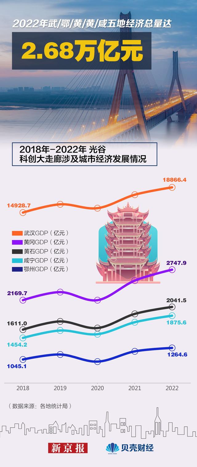 2022年,武、鄂、黄、黄、咸五地经济总量达2.68万亿元,相比2018年增长26.3%。咸宁经济增长最快,相较2018年增长29%。2022年,医药制造业、通用设备制造业成为咸宁增长较快的两个工业行业,分别增长45.8%和37.5%。此外,黄冈、黄石增速均超过武汉,黄冈高新技术产业增加值327.9亿元,占GDP比重11.93%。