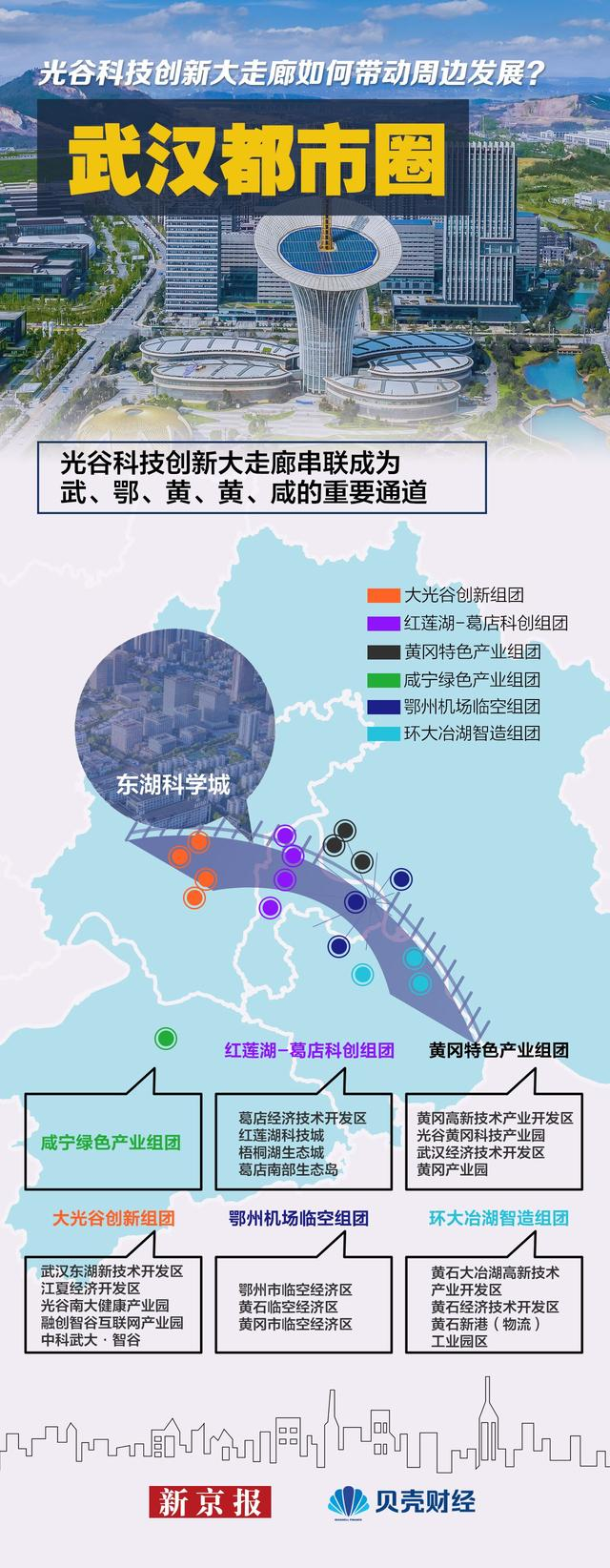 光谷科技创新大走廊是贯通武汉都市圈核心区,带动湖北全域创新发展的重要抓手。它以武汉市东湖高新区为核心承载区,联动武汉市武昌区、洪山区、江夏区,辐射带动鄂州市、黄石市、黄冈市、咸宁市。