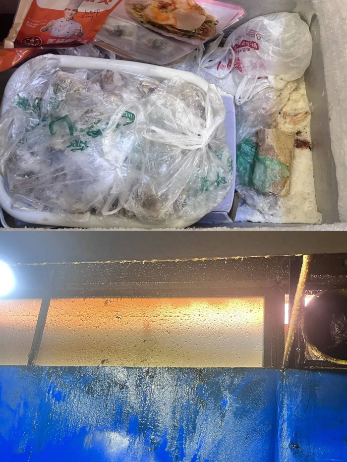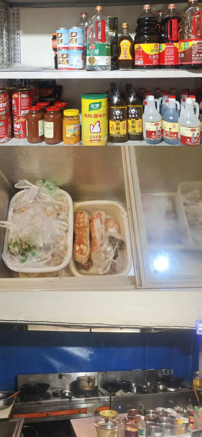 存在问题:冰柜内物品混杂,缺少清理,部分食物裸露混放,存在因未及时清理而导致过期浪费的风险和食品安全隐患。厨房油烟机、操作区积有大量油污。