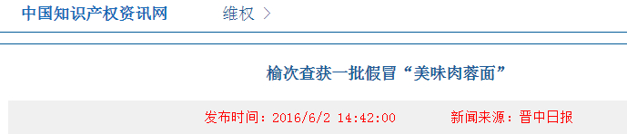 木秀于林,风必摧之。犹如康师傅和康帅博、雪碧和雷碧、奥利奥和粤利粤,快乐牌美味肉蓉面同样遭遇了“有人模仿我的面”。太原广播电视台的《新闻快车》曾于2016年做过一期《真假难辨!肉蓉面出现“孪生版”》,介绍了上海冠生园工作人员远赴太原维权的经历。太原、晋中两地执法部门重视举报,快速反应,积极打击生产经营假冒食品行为,有效净化了市场消费环境。遗憾的是,尽管山西人倾力爱护舌尖上的正版,仍然无法禁绝“李鬼”扰乱市场秩序。