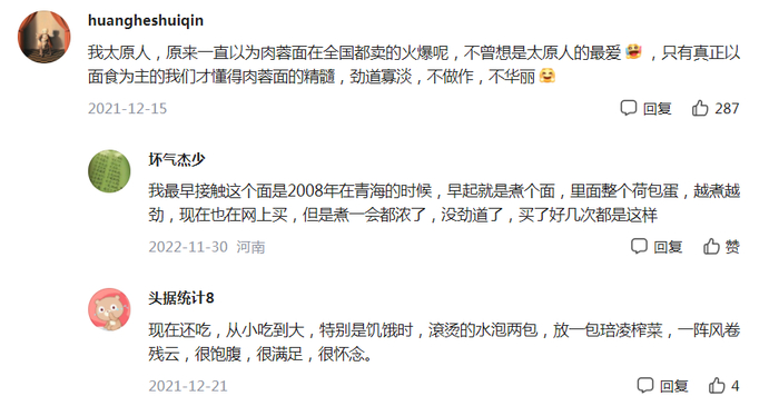 油纸包装,红色打底,蓝色字体,黄色点缀,拆开后仅一枚面饼加一粉包。肉蓉面看似平平无奇,实则内有乾坤。一,极具年代感的包装几十年不变,极简风格易识别,和椰树椰汁一样令人过目不忘。二,表里如一,一点也不花里胡哨,无需“图片仅供参考,请以实物为准”,煮一碗面和包装上一致。三,面饼硬,耐煮,适宜火锅、麻辣烫入味而不糊不烂。口感劲道接近手擀面,味道清淡却有一股醇香,中庸平和,与晋人质朴厚道,稳重得体的性格形象相契合。在山西,特别是太原、晋中,肉蓉面在一众快餐小吃中牢牢占据C位。它是太原“深夜食堂”抚慰夜间工作者的一抹温暖,是早起的父母为上学的孩子倾注的期盼,是老朋友欢聚散场前厚重的告别式。只能煮不能泡,口味单一,这款不方便的方便面,在他乡开出了花朵。