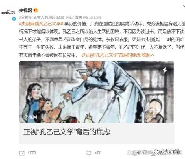 最近,互联网上热传的一段话是:“如果我没读过书,我还可以找别的活做,可我偏偏又读过书”。“学历不仅是敲门砖,也是我下不来的高台,更是孔乙己脱不下的长衫。”这两条评论引发了无数网友的热议。看似青年人在无病呻吟,痛斥“读书无用论”,然则孔乙己文学并没有像“读书无用论”一般招致大片声讨,反倒引得普遍共鸣。