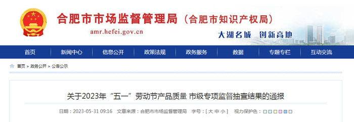 中国质量新闻网讯 据合肥市市场监管局网站5月31日消息,2023年“五一”期间,该局组织开展了“五一”劳动节产品质量市级专项监督抽查工作,现将监督抽查情况通报如下: