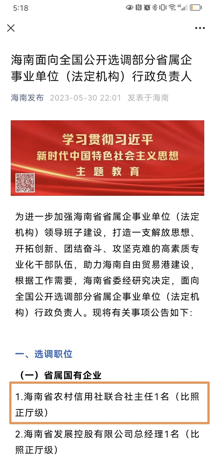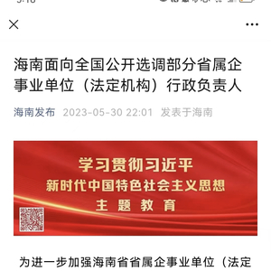 5月30日晚间,海南省委组织部通过“海南发布”公众号对外发布干部选调公告称:根据工作需要,海南省委经研究决定,面向全国公开选调部分省属企事业单位(法定机构)行政负责人,包括海南省农村信用社联合社主任在内的六个厅级岗位(比照厅级)向全社会公开选调。