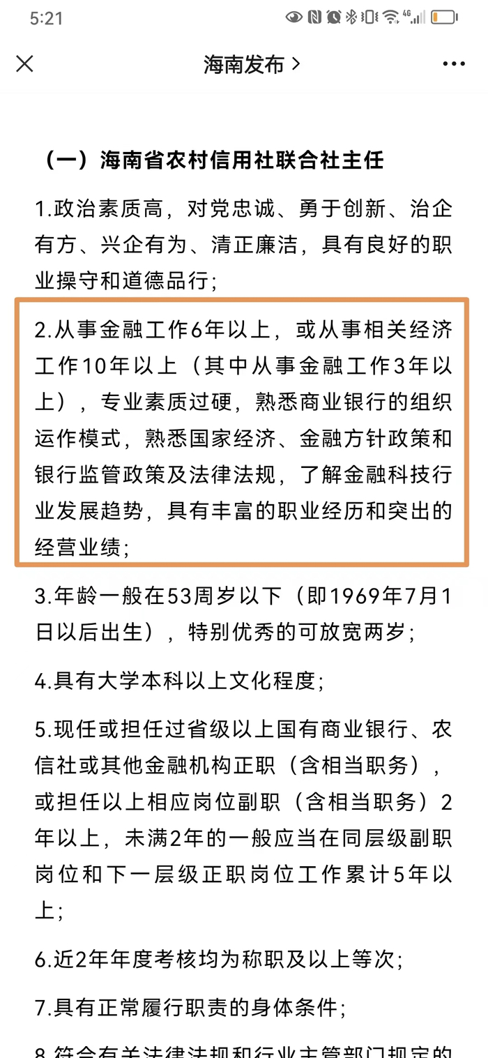 海南省委组织部的海选公告显示,对于报名海南省联社主任,须符合若干硬性条件,包括现任或担任过省级以上国有商业银行、农信社或其他金融机构正职(含相当职务),或担任以上相应岗位副职(含相当职务)2年以上,未满2年的一般应当在同层级副职岗位和下一层级正职岗位工作累计5年以上;