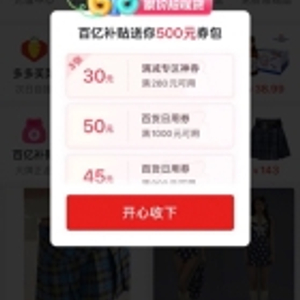 活动期间,消费者打开拼多多APP,进入百亿补贴频道,就可以看到百亿补贴大额券领取入口,点击“开心收下”即可领券。