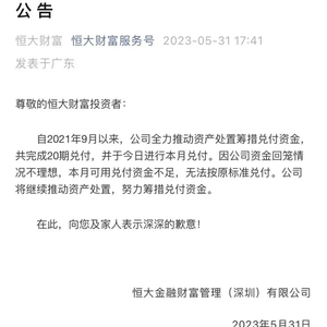 5月31日,恒大财富官微发布公告称,自2021年9月以来,公司全力推动资产处置筹措兑付资金,共完成20期兑付,并于今日(5月31日)进行本月兑付。因公司资金回笼情况不理想,本月可用兑付资金不足,无法按原标准兑付。公司将继续推动资产处置,努力筹措兑付资金。