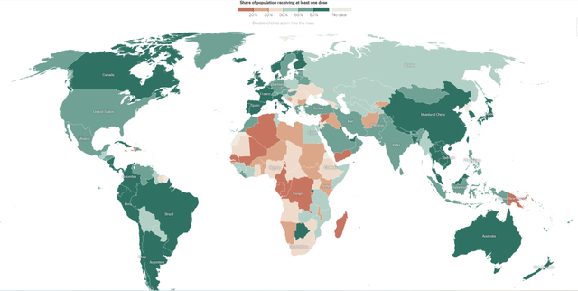 据牛津大学“Our World in Data”的项目统计,截至2023年3月23日,超过55.5亿人接种了至少一剂新冠疫苗,相当于全球人口的约72.3%。美国疾病控制和预防中心(US Centers for Disease Control and Prevention)在其网站表示:“接种新冠疫苗的好处仍然超过任何潜在风险”,并建议“每个 5 岁及以上的人都接种新冠疫苗”。