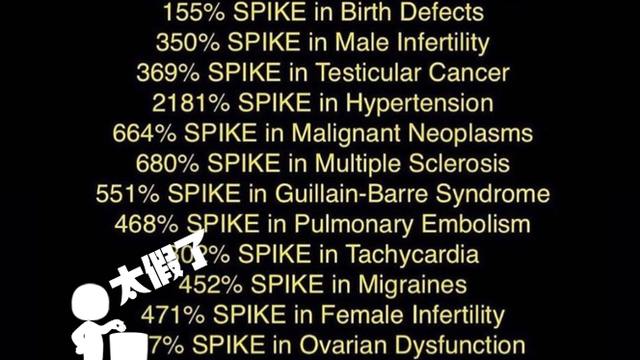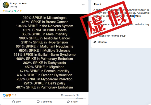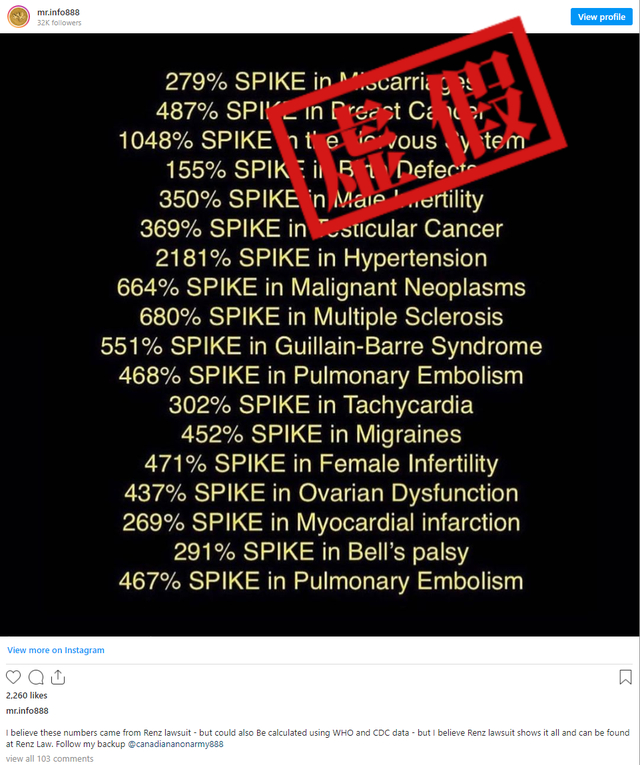 同一时期内,在Facebook和Instagram上也流传着相似的帖子且展示了更为详细的数据。这些帖子声称生育问题、癌症、神经系统疾病和心脏病等一系列的健康问题因接种新冠疫苗而激增,这些说法都指向律师托马斯·伦兹在“新冠疫情:第二次意见”听证会上提供的数据。