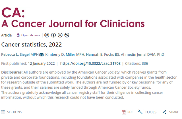 美国癌症协会关于近年美国新发癌症病例和死亡人数的报告