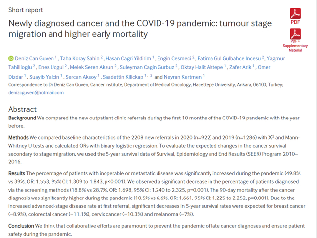 《英国医学杂志》:新诊断的癌症和新冠大流行:肿瘤分期迁移和更高的早期死亡率