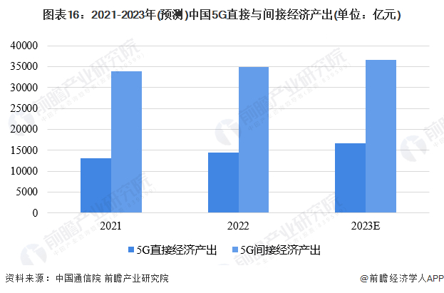 根据工信部《“十四五”信息通信行业发展规划》数据,2020-2025年,中国信息通信行业年均增速目标为10%。鉴于5G通信市场增速高于整体信息通信行业增速,因此2023年预测5G产业的直接与间接经济产出增速分别为15%、5%,故2023年预测的5G产业直接经济产出为16675亿元,间接经济产出为36645亿元。