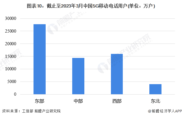 根据工信部发布的2023年第一季度通信业经济运行情况,截至2023年3月末,东、中、西部和东北地区5G基站分别达到124.4万、57.5万、65.7万和16.9万个,占本地区移动电话基站总数的比重分别为25.7%、23.5%、21.1%和23.1%。5G移动电话用户分别达27693万、14370万、15964万和3971万户,占本地区移动电话用户总数的比重分别为37.5%、36.2%、35.5%和33.3%。