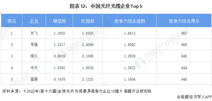 在光纤光缆领域,根据亚太光通信委员会和网络电信信息研究院联合主办的《全球|中国光通信最具竞争力企业10强》评选活动上所发布的《2022年(第十六届)全球光纤光缆最具竞争力企业10强》榜单,中国5G行业光纤光缆排名前5的企业为长飞、亨通、烽火、中天、富通。