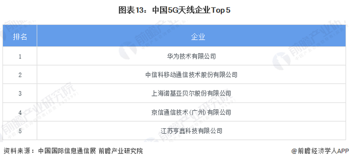 在基站天线领域,根据中国国际信息通信展发布的2021年5G天线企业排行榜单,排名前五的企业分别是华为技术有限公司、中信科移动通信技术股份有限公司、上海诺基亚贝尔股份有限公司、京信通信技术(广州)有限公司、江苏亨鑫科技有限公司。