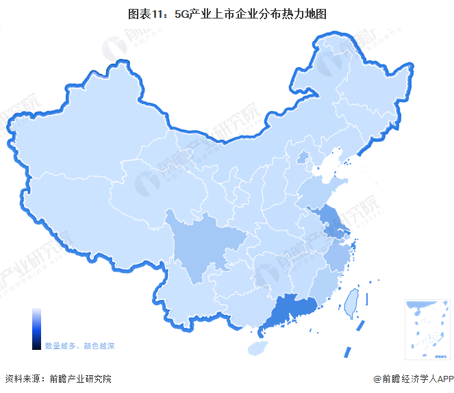从5G产业上市企业分布热力地图来看,5G相关概念的上市企业主要集中在广东。此外,北京、江苏、浙江、四川、上海、山东也拥有一定数量的上市企业。