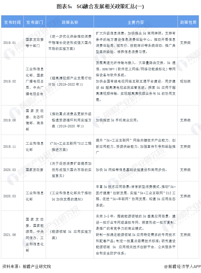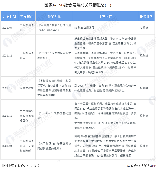 自2015年以来,中共中央、国务院及其各部委等部门都陆续印发了支持、规范5G产业的发展政策,政策性质主要为规划类和支持类,内容主要涉及5G研发、基站建设、商业应用、工业互联网等方面。其中不得不提到的政策当属《5G应用“扬帆”行动计划(2021-2023年)》,该政策以5G融合应用为中心思想,推动5G与各行业的融合。其余5G行业融合发展的重点政策汇总如下: