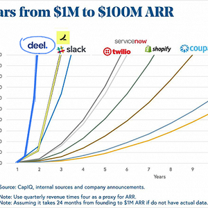 很快,借着疫情和远程办公的东风,成立仅20个月,Deel就实现了ARR由100万美元到1亿美元的百倍增长,增速超过Slack、Shopify、Twilio等多家以增长迅速闻名的SaaS独角兽公司,而且刷新了Slack24个月ARR破亿的记录,成为世界上增长最快的SaaS企业。