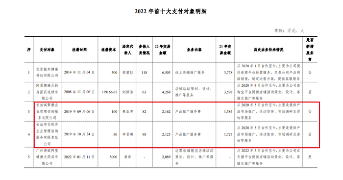 2022年度,振东制药前十大支付对象包括北京振东健康科技有限公司(以下简称“振东健康”)、长治诚聚康企业管理咨询服务有限公司(以下简称“长治诚聚康”)、长治市圣悦齐企业管理咨询服务有限责任公司(以下简称“长治圣悦齐”)、长治泓恺叶晟企业营销策划有限公司(以下简称“泓恺叶晟”)等企业。